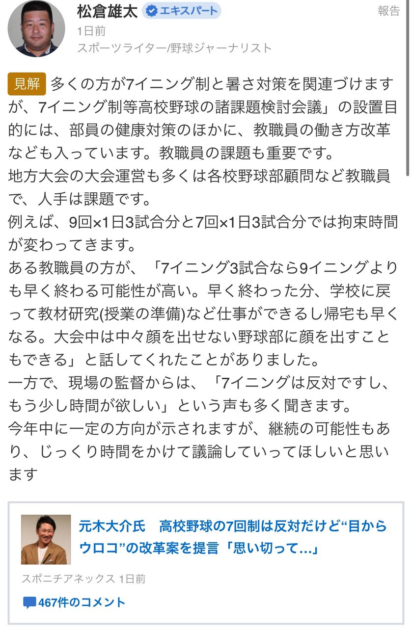 多くの方が7イニング制と暑さ対策を関連づけますが、7イニング制等高校野球の諸課題検討会議」の設置目的には、部員の健康対策のほかに、教職員の働き方改革なども入っています。教職員の課題も重要です。
