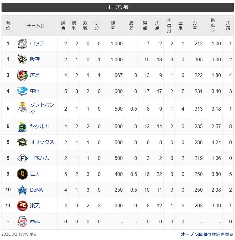 1 阪神 2試合 1勝 0敗 1分 1.00 得点16 失点13 本03 盗00 率.395 防6.00 失02