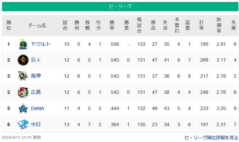 【4/11】●●●中日●横浜 広島○阪神○読売○東京○