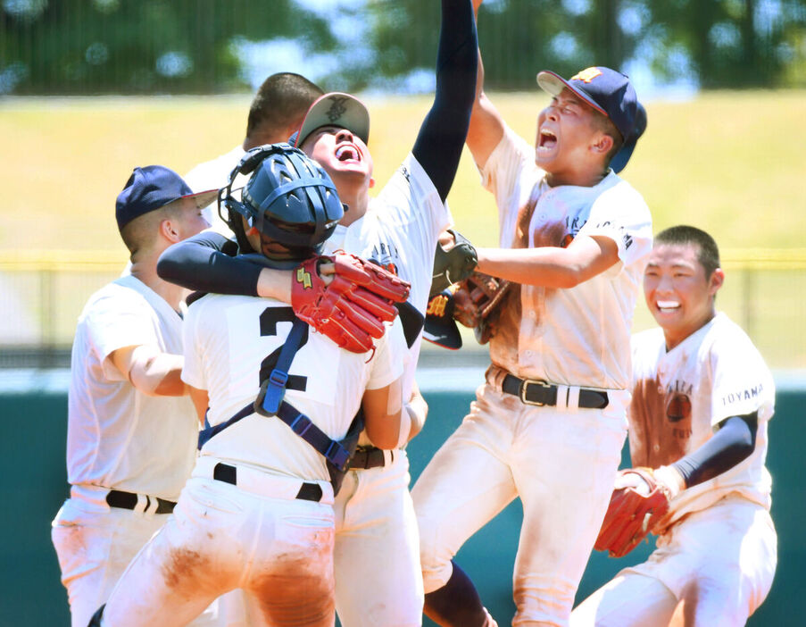 創部8年目。初めての甲子園切符をつかんだ未来富山ナインがマウンドに集まり喜びを爆発させた。序盤3回までに7点を奪い、その後も追加点を重ね、高岡商の反撃をしのいだ。