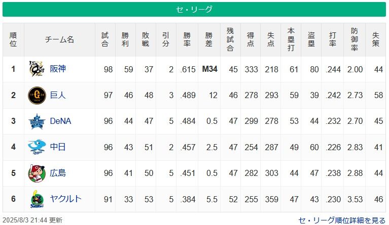 【セスレ順位】神M34============巨-横==-中-広=====-ヤ【8/3】
