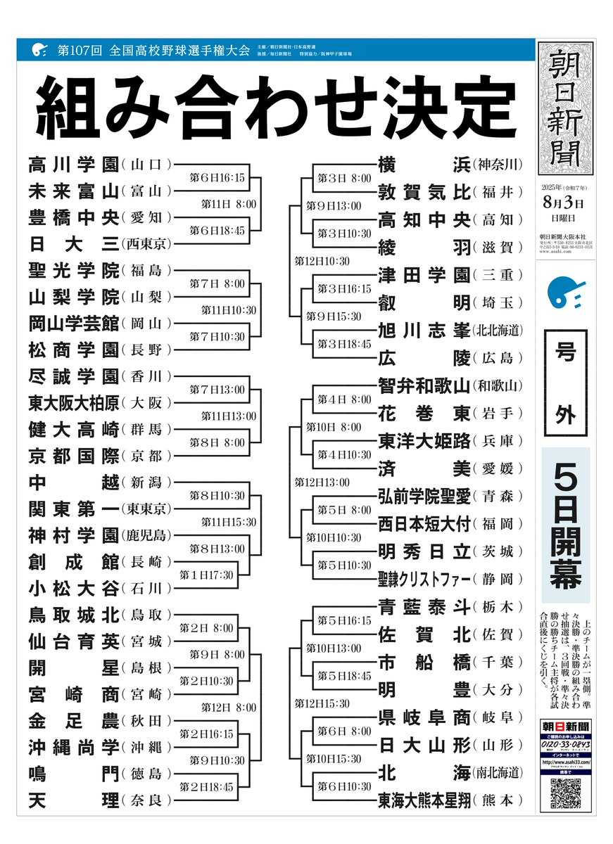 第107回全国高校野球選手権大会(8月5日開幕、甲子園)の組み合わせ抽選会が3日、大阪市内で行われた。