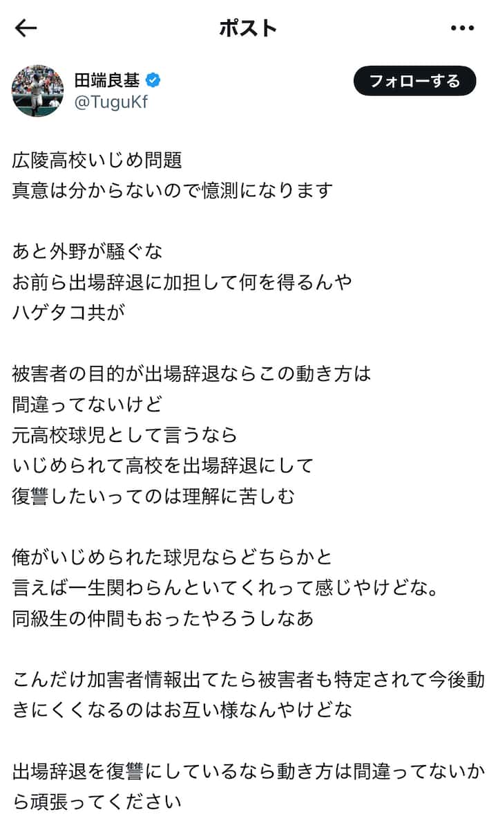 田端氏はほかにも、「これに関しては悪いけどそう言うのあるとこは一生無くならん。ま。エグいのは無くなるんやけど小競り合いはあるよ。今回の広陵の件」「約10年前で言うとん?何が問題なん?レベルの話」「俺は大阪桐蔭で起きた出来事親に相談した事が無かった」とつづっている。