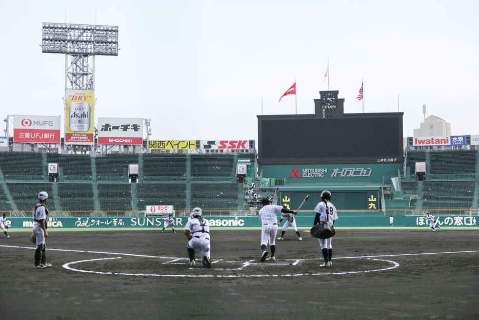 1時間の練習を終え、本塁に整列。無人の観客席へ、声を張り上げて校歌を歌った。「校歌の2回目が歌えなかったので、自分たちは本当にリセットしたかったので歌わせていただいた次第です」と佐川竜朗監督。全員で思いを一つにし、次戦の横浜(神奈川)戦へ気合を入れ直した。