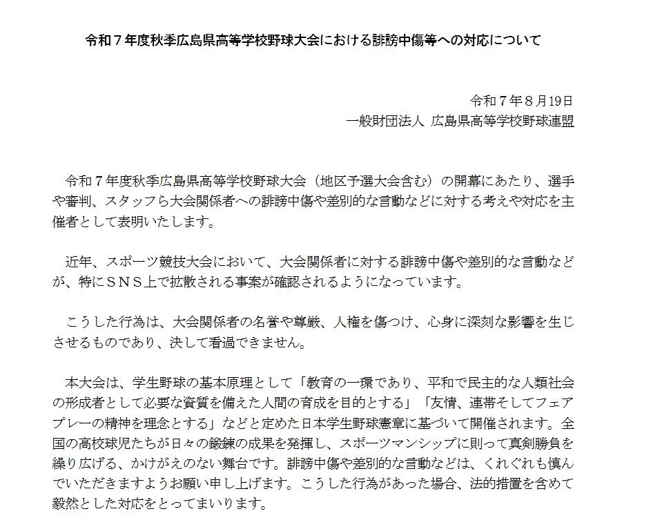 令和7年度秋季広島県高等学校野球大会における誹謗中傷等への対応について