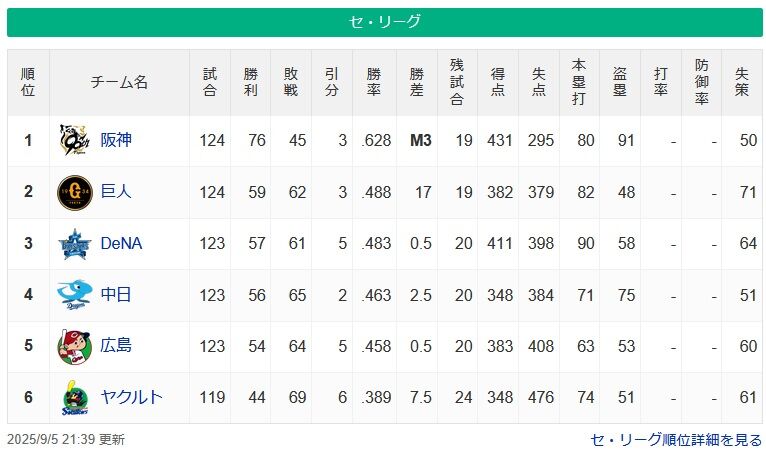 【9/5】セ順位 阪神M3=================巨人-DeNA==-中日-広島=======-ヤクルト
