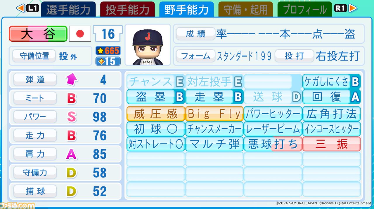 コナミデジタルエンタテインメントは、6月11日に発売を予定しているプレイステーション 4/Nintendo Switch用野球・育成「パワフルプロ野球2026-2027(パワプロ2026)」における大谷翔平選手の能力を公開した。