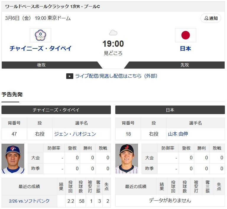 本日の日本の先発は山本由伸!台湾の先発は…