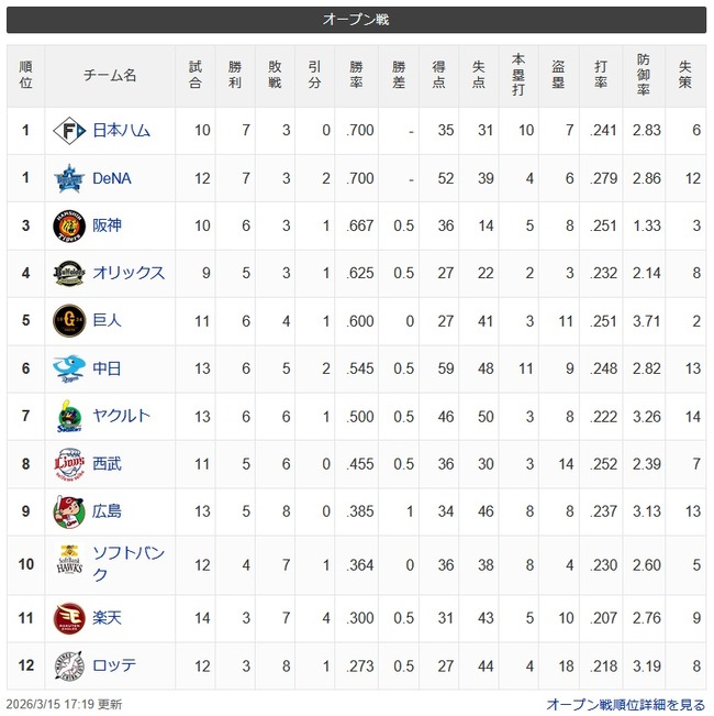 1 日公 10試合 7勝 3敗 0分 .700 得点35 失点31 本10 盗07 率.241 防2.83 失6