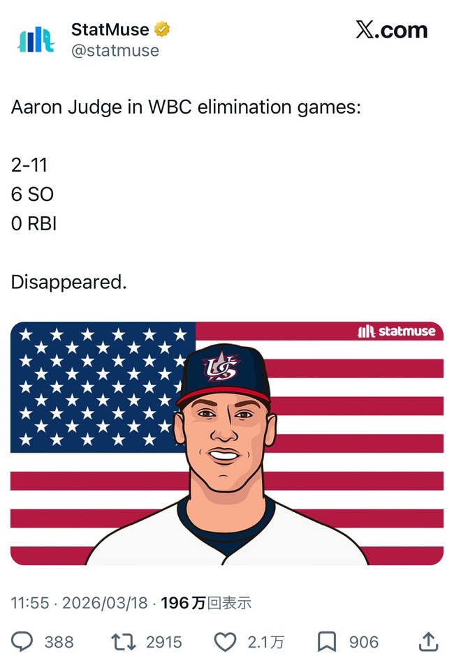 【悲報】アーロン・ジャッジさん、米国メディアから次々と叩かれ初めてしまう WBC X Facebook はてブ LINE コピー 2026.03.19 スポンサーリンク 転載元: https://nova.5ch.io/test/read.cgi/livegalileo/1773912092/1: それでも動く名無し 2026/03/19(木) 18:21:32.51 ID:67P36FDQ0 続きを読む