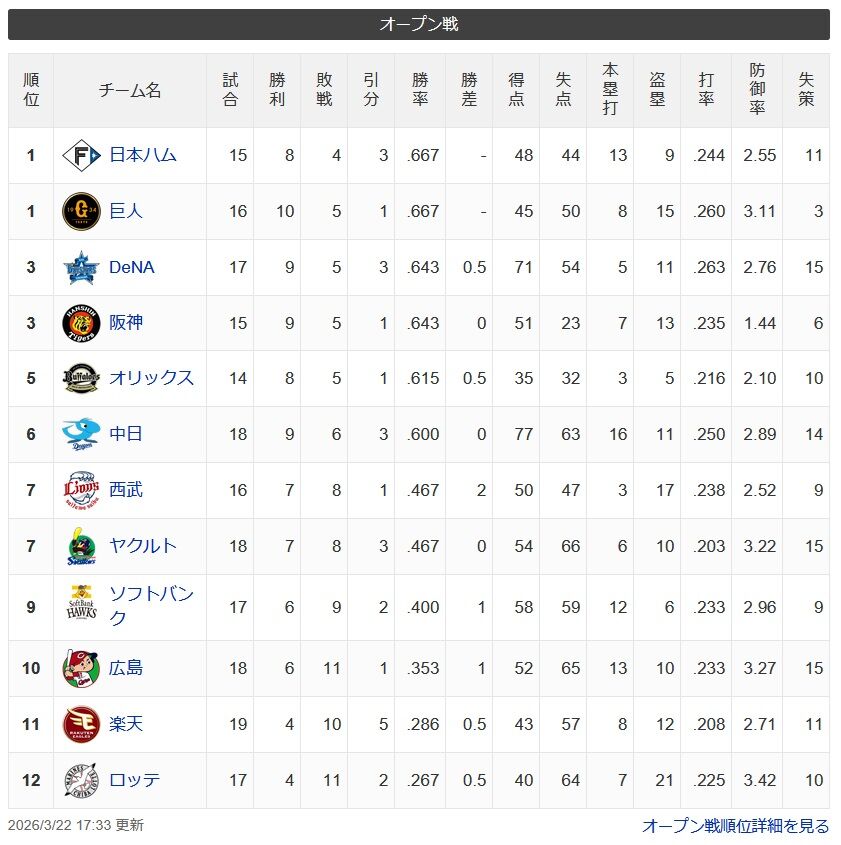 1 日公 15試合 8勝 4敗 3分 .667 得点48 失点44 本13 盗09 率.244 防2.55 失11