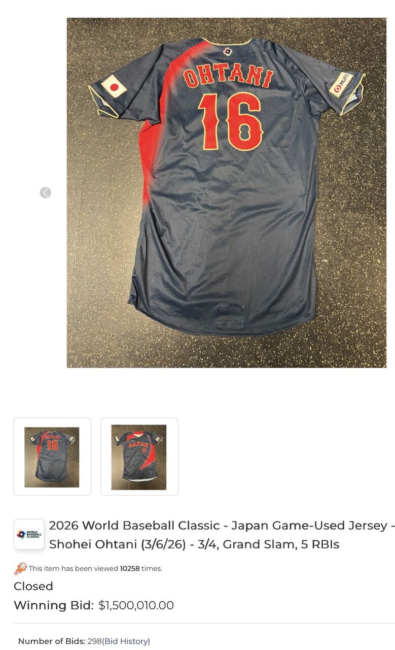 【朗報】大谷翔平着用WBCユニフォームが2億3900万円で落札wwwww WBC X Facebook はてブ LINE コピー 2026.03.23 スポンサーリンク 転載元: https://nova.5ch.io/test/read.cgi/livegalileo/1774276852/1: それでも動く名無し 2026/03/23(月) 23:40:52.50 ID:RQ8YuCI10 WBCで大谷が着用したユニフォーム 150万10ドル(日本円 2億3900万円)で落札 ※本人サインなし 続きを読む