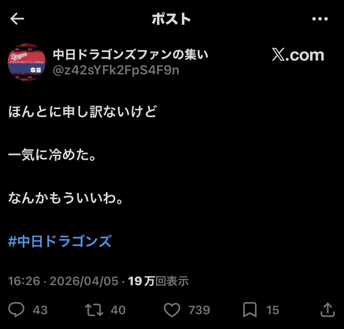 【悲報】中日ドラゴンズ(チュニドラ)ファンさん「なんかもういいわ。一気に冷めた。」 セ・リーグ X Facebook はてブ LINE コピー 2026.04.05 スポンサーリンク 1: それでも動く名無し 2026/04/05(日) 20:48:12.460 4: それでも動く名無し 2026/04/05(日) 20:48:39.566 一体何があったんや… 5: それでも動く名無し 2026/04/05(日) 20:48:43.017 でもちょっと見たろ 続きを読む