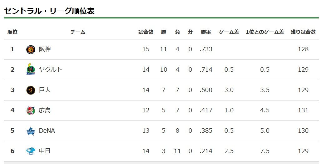 なんでまだ14試合しかしてないのに首位と7.5ゲーム差も離れてんの?
