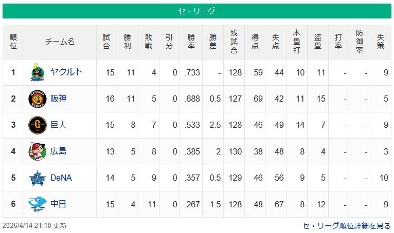 ヤクルト1位返り咲きか