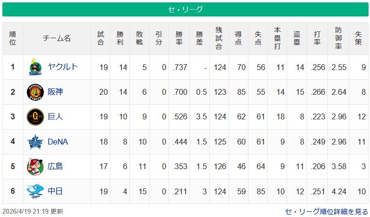 【セリーグ】ヤ-神-===巨-//=横-=広===中【4/19】