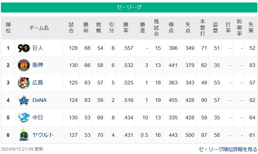 こう見ると巨人相手に捲れるとすればやっぱり虎かなあ